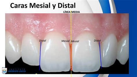 Para poder entender e identificar la cara medial del diente es necesario realizar una línea imaginaria desde los dientes centrales, dejando así dividida la boca en dos partes iguales. Trazando una línea desde los dientes centrales, dividiendo en dos la boca, la cara mesial de cada pieza dental será la cara (lateral) del diente que quede más próximo a esta línea.