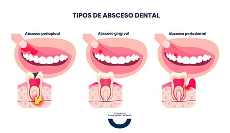 Existen tres tipos de abscesos dentales: el absceso gingival, el periapical y el periodontal.