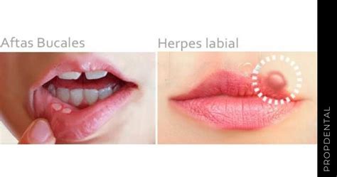 La principal diferencia entre las aftas bucales y el herpes labial, es que el segundo es causado por un virus, mientras que las primeras no son un virus. Además, las aftas aparecen en el interior de la boca y el herpes, se produce en la parte exterior de los labios o alrededor de ellos. Por último, las aftas son lesiones con el centro blanco o amarillo y el borde enrojecido, mientras que el herpes es un bulto a grupo de ampollas que se rompen y llegan a formar úlceras.