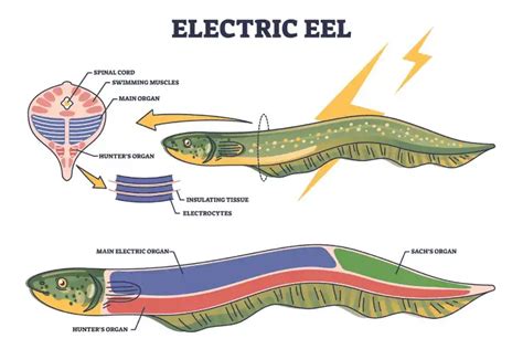 Si bien las anguilas eléctricas pueden alcanzar una longitud corporal de hasta 8 pies, solo el 20% de esa longitud contiene sus órganos vitales. Toda la parte posterior de la anguila, el 80% de su cuerpo, se corresponde con órganos eléctricos. Incluso su piel está cubierta por células electroreceptoras tuberosas y ampulares.