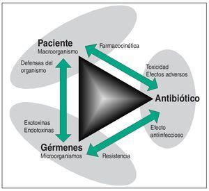 Desde un punto de vista lingüístico, sería más apropiado usar el término "fármacos antiinfecciosos" en lugar de antibióticos. Los antibióticos se distinguen de otros fármacos porque su acción está dirigida a los microorganismos y no a las estructuras del organismo humano. La evaluación de un antibiótico se basa en la relación triangular: principio activo-macroorganismo-microorganismo.