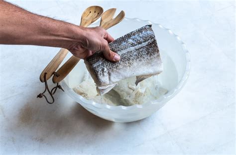 Desalado del bacalao: Colocamos el bacalao en una fuente-bol y cubrimos totalmente con agua. Si son piezas gruesas emplearemos 48 horas, con cambios de agua cada 6 horas. Durante el tiempo de desalado, tendremos la fuente con el pescado en el frigorífico, para que tenga una temperatura estable y constante. Pasado este tiempo, se recomienda probar un trozo para comprobar que ya no está salado.