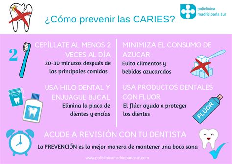La eliminación de la placa dental mediante el cepillado dental diario de los dientes después de cada comida. Evitar la ingesta los alimentos con alto potencial cariogénico como los chucherías, refrescos, zumos industriales, bollería, cereales azucarados, galletas, chocolate o patatas chips. Evitar el picoteo entre comidas. Aumentar la resistencia de los dientes mediante el uso del flúor y los selladores de fisuras.