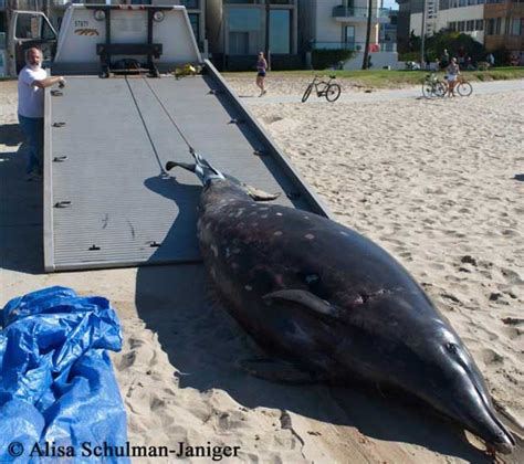 Una ballena poco común que tiene una cabeza en forma de delfín y los dientes como sables ha sido encontrada muerta en la playa de Los Ángeles Venice, aunque prefiere las frígidas aguas subárticas. La ballena picuda de Stejneger hembra - también Zifio de Stejneger o zifio del mar de Bering (Mesoplodon stejnegeri) - de 15 pies de largo y 900 kilos de peso llegó a la orilla más o menos la noche del martes, informó el diario Los Angeles Times. Un camión remolcó al mamífero, que se está examinando en el Los Angeles County Natural History Museum para determinar la forma en que murió.
