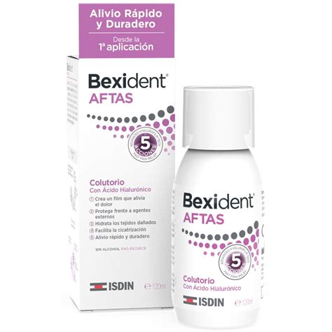 | Bexident Aftas Colutorio Bucal | Aftas, úlceras, estomatitis, heridas | Ácido hialurónico | Enjuagar la boca durante 1 minuto |