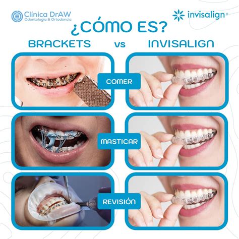 - Para el paciente: Las diferencias entre brackets e Invisalign son claras, ya que Invisalign son alineadores extraíbles que se retiran para comer y cepillarse. Además de la comodidad y la estética, las fuerzas aplicables a los dientes son muy suaves y prácticamente molestas porque se producen en toda la superficie del plástico. No produce llagas tan frecuentes en los brackets y no se generan urgencias.