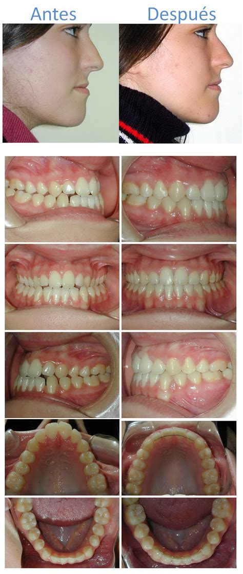 | Sobremordida excesiva (incisivos superiores cubren demasiado) | Mentón retraído, cara redonda/cuadrada, mejillas hundidas. | Perfil más recto, mentón más definido, mejillas con mejor soporte. |