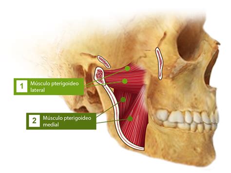 Los músculos pterigoideos, lateral y medial, son fundamentales para la función masticatoria. El músculo pterigoideo lateral se inserta en la apófisis pterigoides y en el cuello del cóndilo de la mandíbula, y su contracción produce la protrusión y lateralización de la mandíbula. El músculo pterigoideo medial se inserta en la fosa pterigoidea y en la cara medial de la rama de la mandíbula, y su contracción eleva la mandíbula.