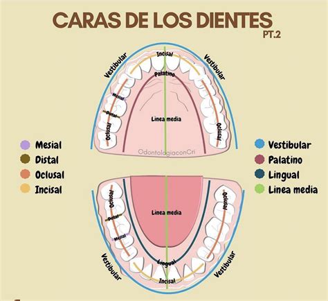 - Cara Mesial: Para identificarla, se traza una línea imaginaria desde los dientes centrales, dividiendo la boca en dos partes iguales. La cara mesial es la que está orientada hacia esta línea media. Es la cara que está hacia la línea media del cuerpo. Por ejemplo, la cara mesial del incisivo central superior derecho sería la que está en contacto con el incisivo central superior izquierdo.