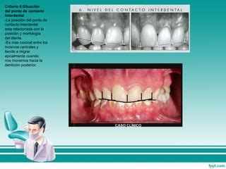 El punto de contacto interdental es el punto de la zona de contacto situado más hacia incisal. En dientes anteriores correctamente formados y dispuestos estéticamente, los puntos de contacto interdentales ascienden claramente hacia la zona de los dientes posteriores.