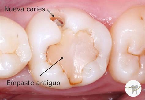 En la imagen de la izquierda se aprecia una caries debajo de un empaste antiguo. Es importante tener en cuenta que el diagnóstico temprano de las caries, repercutirán en un mejor pronóstico del diente. En obturaciones (empastes) antiguos, controlaremos que los márgenes de las restauraciones estén correctos, ya que en la resina (material del empaste) no se producirán caries, pero en el diente de alrededor sí pueden aparecer.