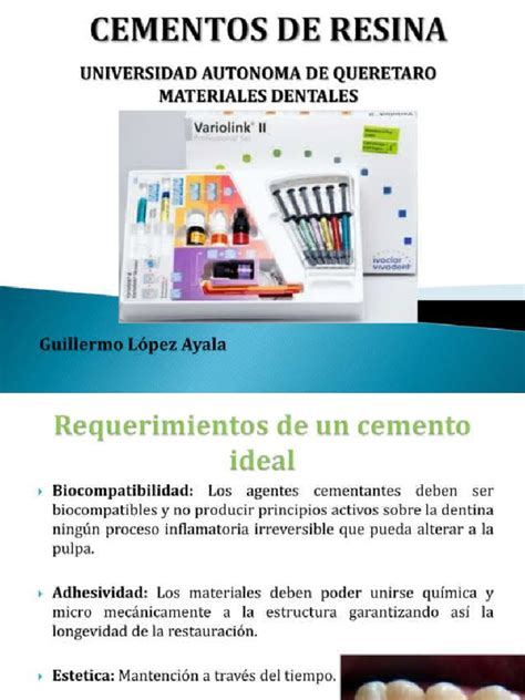| Resina | Monómero metacrilato, ácidos monómeros funcionales y relleno | Excelente adhesión, propiedades estéticas | Cementación de coronas, puentes, brackets |