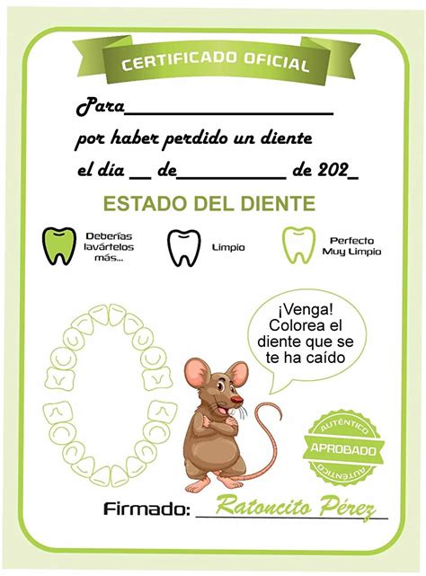 - Descripción del diente: Una descripción del estado del diente que el Ratoncito Pérez se va a llevar. Esto es una forma genial de concienciar a los pequeños para mantener una buena higiene bucodental. Se pueden usar frases como: "Este diente está muy limpio y reluciente" o "Demasiadas chuches, hay que cuidar mejor los dientes".