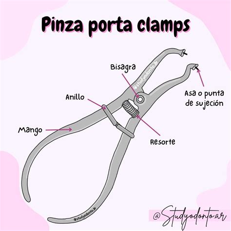 Un clamp dental es una abrazadera metálica diseñada para sujetar la zona cervical del diente. Su inserción se realiza mediante un porta-clamps o fórceps especiales que abren el clamp al introducir la pinza en los orificios laterales.