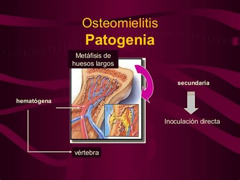Las posibles vías de transmisión son tres: hematógena (la más frecuente), por inoculación directa y por invasión local desde una infección contigua (artritis, sinusitis, infección dental, etc.). *Staphylococcus aureus* es el principal agente etiológico de la osteomielitis en todas las edades.