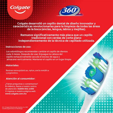 El cepillo de dientes Colgate 360° ofrece un cuidado superior para toda la boca. El diseño único del cepillo con cerdas cónicas muy compactas, una punta elevada, copas de pulido de goma blanda y un limpiador de lengua texturizado elimina más placa que un cepillo manual normal.