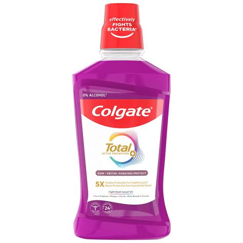| Colgate Enjuague Bucal Total Advanced Encías Sanas | Combate la placa, fortalece las encías, acción antibacteriana. | Enjuagar durante 30 segundos después del cepillado. |