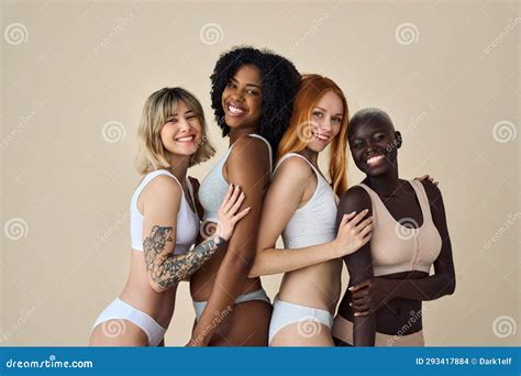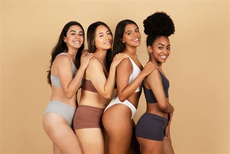 La moda actual celebra la diversidad y la autoaceptación. Un grupo diverso de mujeres jóvenes usando ropa interior representa esta idea, promoviendo la belleza en todas sus formas.
