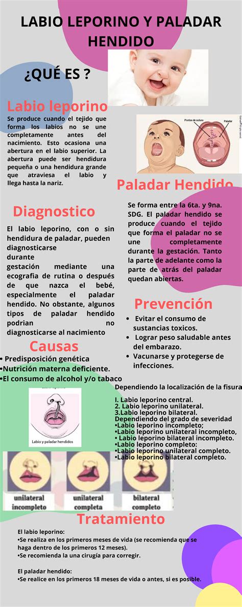- Labio leporino: Es una deformación en la que el labio no se forma completamente durante el desarrollo fetal. El grado puede variar desde un leve corte en el labio hasta una gran abertura que llega a la nariz.
