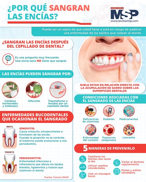 El sangrado de encías puede ser un síntoma de gingivitis o periodontitis. Una encía sana no tiene que sangrar. En la gran mayoría de los casos, la causa del sangrado de encías y su inflamación es la existencia de periodontitis o enfermedad periodontal. A veces el sangrado de encías de produce de manera espontánea. Tener una higiene dental buena y constante es el primer paso para detener el sangrado de las encías. Si te sangran las encías visita a tu dentista para una limpieza profesional dos veces al año. Realiza enjuagues bucales de agua tibia con sal ya que ayuda a aliviar inflamación de las encías que sangran fácilmente. El sangrado ocasional de las encías puede ser el resultado de una mala técnica de cepillado por lo que no debes cepillarte los dientes con demasiada fuerza. Usa un cepillo de dientes suave, cerdas medianas y duras pueden ser demasiado abrasivo para unas encías delicadas. La enfermedad periodontal es la infección de las encías, huesos maxilares y de los tejidos que sirven de apoyo para conectar los dientes con las encías. Las deficiencias de vitaminas C y K también pueden causar que las encías sangren fácilmente. Es muy recomendable si te sangran las encías que sigas una dieta que contenga estas vitaminas. Los alimentos ricos en vitamina C incluyen: frutas y jugos cítricos, brócoli, fresas, tomates, papas, pimientos. Trastornos de coagulación pueden provocar que las encías sangren.