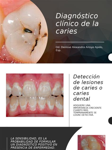 En su inicio puede observarse una mancha de color blanco, que va oscureciéndose con el paso del tiempo, conforme va avanzando la lesión. Aquellas caries que se esconden en la superficie entre dientes son muy difíciles de identificar a simple vista, por lo que en determinadas ocasiones es necesario realizar radiografías intraorales para poder diagnosticarlas a tiempo.