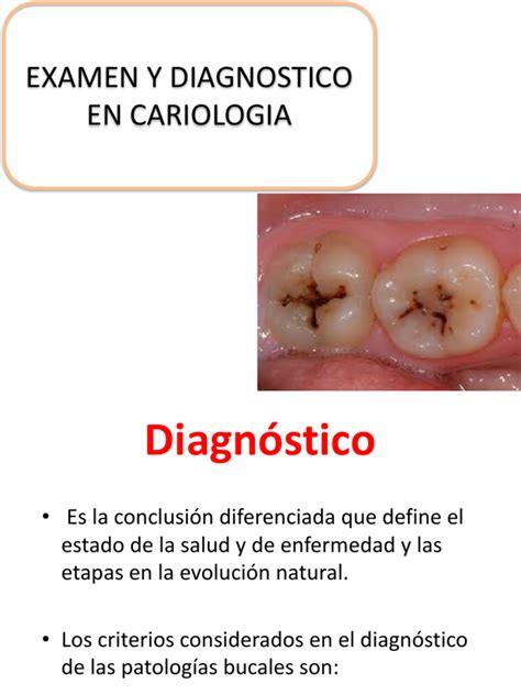 El diagnóstico de la caries se basa en un examen clínico y/o radiográfico. El principal determinante para considerar que la enfermedad está activa es la presencia de lesiones blandas dentro del diente, lesiones que el dentista explorará con una sonda o instrumento específico para tal fin.