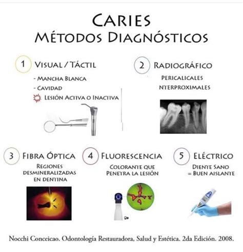 | Examen Clínico | Inspección visual y táctil de los dientes. | Simple, no invasivo. | Subjetivo, puede no detectar caries tempranas. |