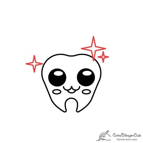Construiremos la estructura base de nuestro dientecito delineando la silueta de una manzana 🍎 en su parte superior ⬆️ mediante dos grandes curvas onduladas 〰️. A continuación, procederemos a ilustrar los rasgos expresivos aportándole un carácter muy adorable a nuestro diente kawaii 🤗. Comenzaremos dibujando dos grandes ojos a través de esferas negras ⚫ con elipses blancas en su interior 👀. La boquita estará representada por un trazo en forma de «m» invertida con un pequeño arquito por debajo que dejará mostrar su lengüita 😋. Como último detalle dibujaremos tres estrellitas luminosas para darle brillo a nuestro dibujo 🦷✨.