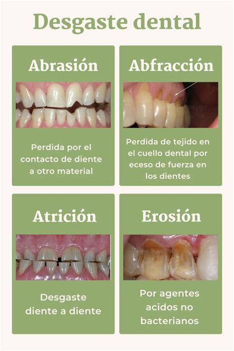 Los tipos de desgaste dental se suelen clasificar en función de las causas que los provocan, siendo los principales: