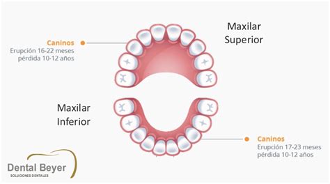 Los caninos temporales o de leche erupcionan entre los 16 y los 23 meses y se desprenden entre los 9 y 12 años. Estos caninos de leche serán sustituidos por los caninos definitivos.
