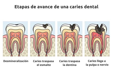 En sus primeras etapas, las caries pueden no presentar ningún síntoma. A continuación, te detallamos los signos que pueden advertir de la presencia de caries. Si la caries progresa, afectará a la dentina (tejido del diente debajo del esmalte) e incluso llegar al nervio del diente. Al principio pueden sentirse molestias al beber o comer alimentos dulces y/o fríos, y más adelante también con calientes. Si sigue evolucionando llegará a causar dolor (odontalgia) e incluso, en ocasiones, puede asociarse con la aparición de flemones.
