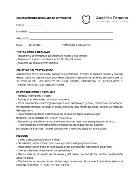 Un documento de consentimiento informado completo para un tratamiento de ortodoncia debe abordar una serie de puntos fundamentales para asegurar que el paciente tenga una visión global y realista de lo que implica el proceso: