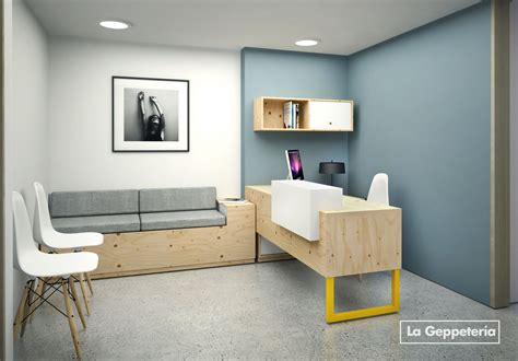 - Mostrador de recepción: Es la pieza estrella al entrar. Debe ser funcional (con espacio para ordenador, archivos, cajones) y estar fabricado en materiales resistentes.