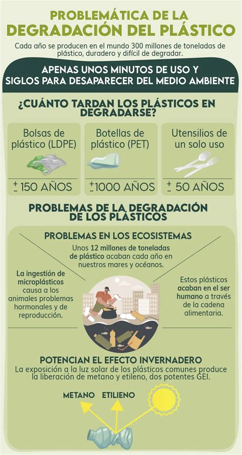 La durabilidad del plástico (que en principio se consideraba una ventaja), ahora es motivo de preocupación debido a su lenta tasa de descomposición, porque tarda un tiempo sorprendentemente largo en degradarse. Tanto es así, que la botella de plástico que consumes hoy seguirá en este mundo cuando tus bisnietos den sus primeros pasos en él.