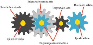 Un engranaje es un mecanismo compuesto por dos ruedas dentadas. En su forma más sencilla, estas ruedas son piezas cilíndricas con levas o dientes tallados en su superficie lateral. Al engranar, los dientes de una rueda se introducen en los huecos de la otra, transmitiendo el movimiento de manera que las ruedas giran en sentido contrario. La rueda con mayor número de dientes se conoce como "rueda", mientras que la de menor número se denomina "piñón".