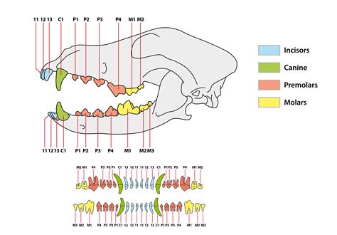 Lobezno: neonato hasta 3 meses; fórmula dentaria: 2 (I 3/3, C 1/1, P 2/2, M 1/1)= 28 dientes de leche.