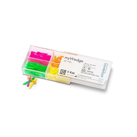 - Cuñas Interproximales myWedge: Fabricadas en plástico con una forma hueca en V, que permite la compresión y adaptación a la anatomía interproximal de los dientes.