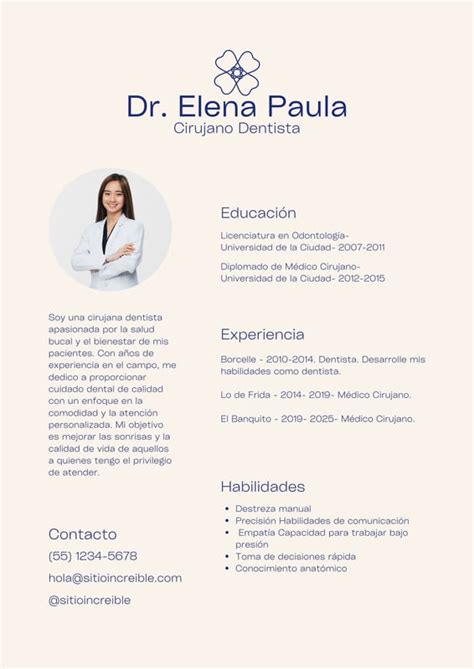 Presentamos un ejemplo de currículum de dentista para ayudarte a destacarte en tu búsqueda de empleo en el campo de la odontología. Este modelo de currículum está diseñado para resaltar tus habilidades, experiencia y educación que te hacen un candidato ideal para puestos en clínicas dentales o consultorios privados.