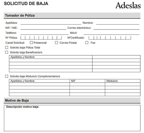 En Adeslas no es necesario redactar tú mismo un escrito de baja. Puedes rellenar una solicitud de baja, un formulario tipo que la compañía puede facilitarte en sus oficinas.