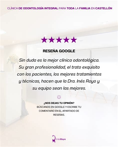 - "Sin duda es la mejor Clínica odontológica. Su gran profesionalidad, el trato exquisito con los pacientes, los mejores tratamientos y técnicas hacen que la Dra. Inés Royo sea única."