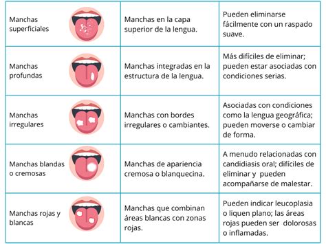 | Lengua Saburral | Capa blanca o amarillenta en la lengua | Mala higiene, candidiasis, infecciones |