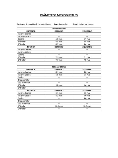 - Obtener los tamaños mesiodistales de la misma población con dentición mixta y dentición permanente.