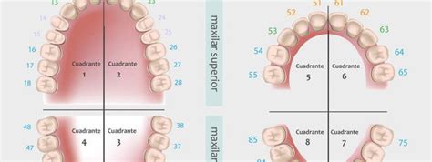 Cada cuadrante tiene 8 dientes y se empieza a numerar desde el incisivo central en dirección al tercer molar o muela del juicio. De esta manera: