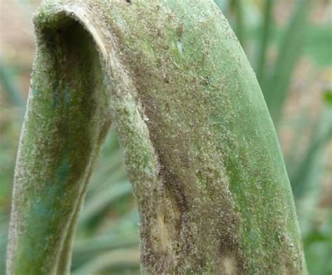 Mildiu velloso: Los síntomas son muy claros: aparece un crecimiento blanquecino y peludo en las hojas, junto con una decoloración amarilla. Puede matar a las plantas más jóvenes y atrofiar el crecimiento de las más viejas. Las puntas de las hojas enfermas y otros tejidos acabarán por colapsar. Los bulbos almacenados tendrán el cuello ennegrecido, estarán arrugados y las escamas exteriores estarán empapadas de agua.