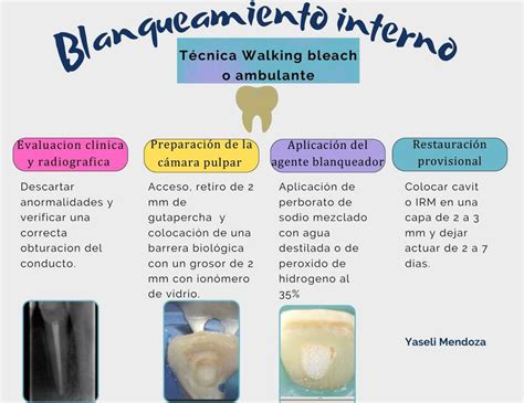 - Blanqueamiento interno: después de una endodoncia, si el diente sigue luciendo gris, morado o con un tono poco estético, puede realizarse un blanqueamiento interno. Se introduce un gel blanqueador en la cámara pulpar y se sella temporalmente hasta que el diente aclare.