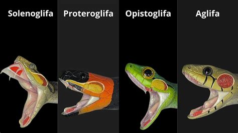 De acuerdo a su capacidad de liberar o no veneno, las serpientes han desarrollado dientes (también llamados colmillos) agrandados sobre la maxila, de tal manera que pueden ser reconocidas en cuatro grupos distintos.