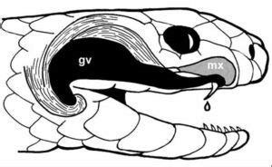 - Glándulas de veneno: Las serpientes venenosas poseen un par de glándulas de veneno especializadas, localizadas en la parte posterior de la cabeza, justo detrás de los ojos, y unidas al colmillo.
