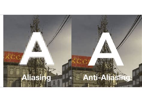 Para combatir este problema, se utiliza una técnica llamada anti-aliasing (AA). El antialiasing es una técnica que tiene como objetivo reducir las distorsiones y artefactos gráficos que aparecen en una imagen de alta resolución cuando esta se presenta a una resolución menor y viceversa.