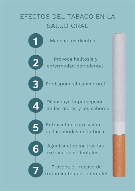 Las secuelas del tabaquismo en la cavidad oral son tinciones de los dientes y de las restauraciones dentales, alteraciones olfatorias y gustativas, retrasos y alteraciones de la cicatrización después de intervenciones de cirugía oral, como extracciones.