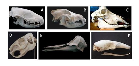 Figura 2. Dentición de erizo (A), lobo (B), antílope (C), roedor (E), delfín (F) y tamandúa (G). Fotos: Sergio Rodríguez (A, B, E y F). J. L. Tellería y M.